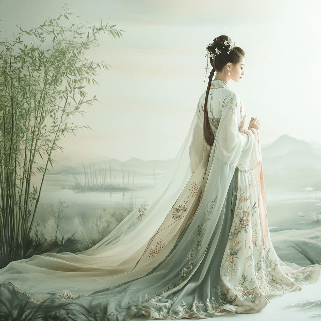 The hanfu is a traditional Chinese garment, worn by the Han Chinese before the Qing Dynasty. It has deep historical roots, representing one of the oldest styles of clothing in Chinese culture. The hanfu is characterized by its elegant, flowing designs and consists of a variety of elements, including a tunic, a skirt, and often a sash or belt. The garment is known for its loose, layered structure and is usually made from silk or other fine fabrics.
